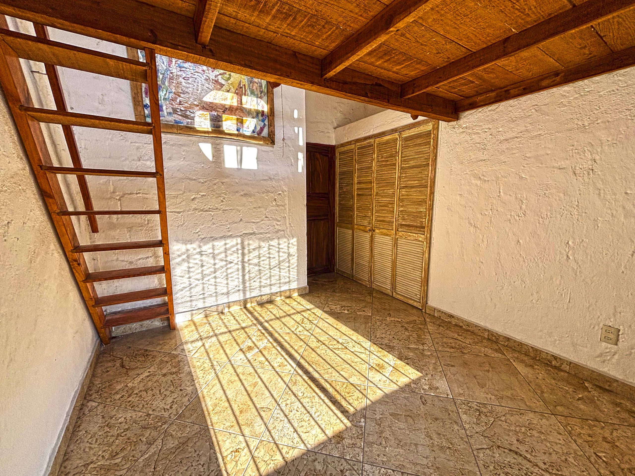Dentro de la habitación podrás ver que existe un tapanco de madera que se instaló por las bondades de la doble altura, mismo que puede funcionar para colocar una cama extra, oficina o espacio de almacenaje. Es importante que sepas que si no es de tu agrado podemos retirarlo sin problema alguno.